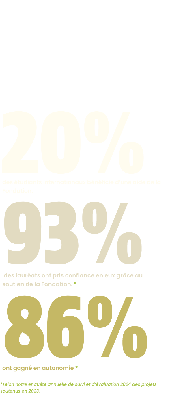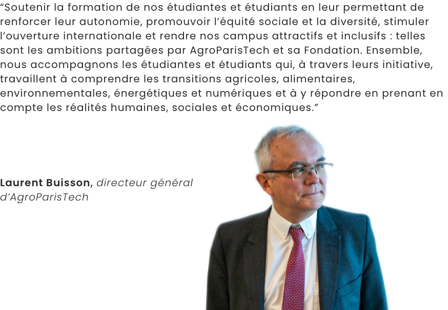 La Fondation AgroParisTech s’engage à offrir à chacun et chacune les mêmes opportunités de réussite tout au long de leur parcours à AgroParisTech, qu’ils soient ici ou ailleurs. Pour cela, elle propose plusieurs dispositifs :